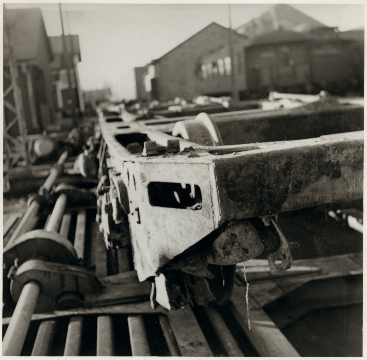 Titel: Skador på A-vagnens löpboggi efter olycka vid hållplatsen Arket 1951.