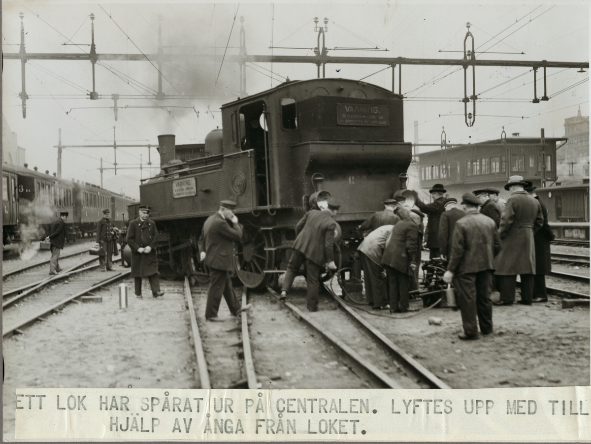 Statens Järnvägar, SJ K 1160, bärgning av urspårat lok på Stockholms Centralstation november 1930.