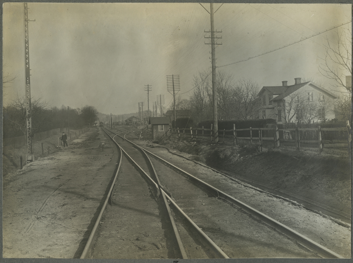 Titel: Alingsås bangård med anslutningsväxel till dubbelspår i förgrunden.