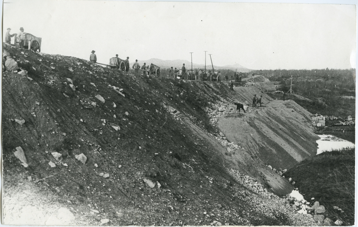 Titel: Järnvägsbyggnaden av Riksgränsbanan. Allt arbete gjordes för hand under mycket svåra förhållanden.