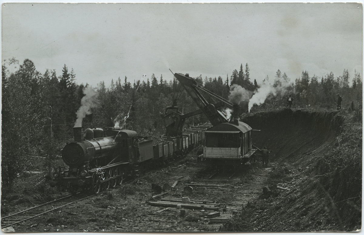 Titel: Banbyggnad Inlandsbanan. Text på baksidan:Sorsele-Arvidsjaur.Ulriksfors-Volgsjön.Gåxsjögropen Lövberga