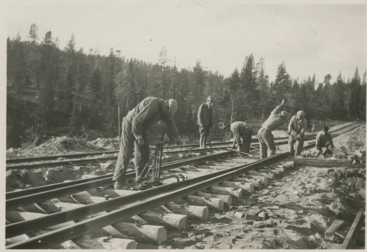 Titel: Banbyggnad Inlandsbanan. Text på baksidan:"Norsken Arntsen med rälsborrningsmaskin"