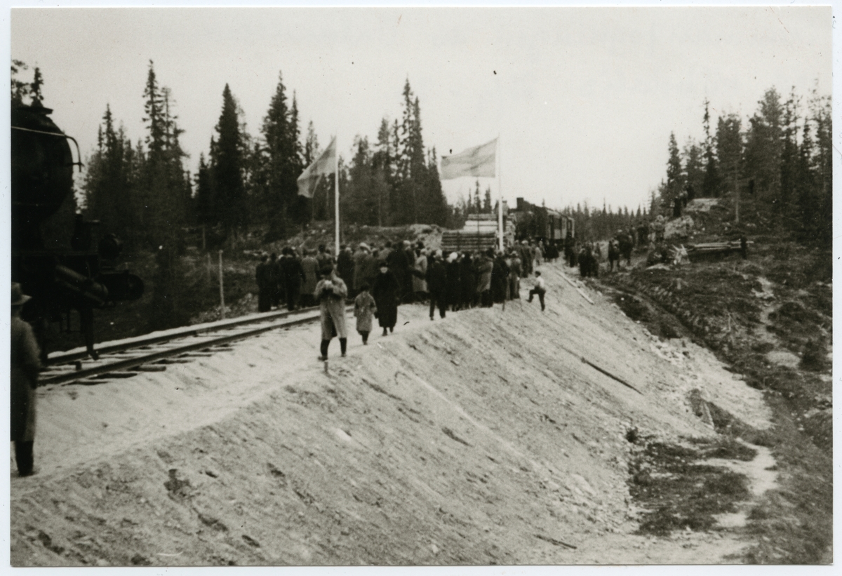 Titel: Banbyggnad Inlandsbanan. Sammanfogningen av Inlandsbanan vid Kåbdalis 1936-09-26.