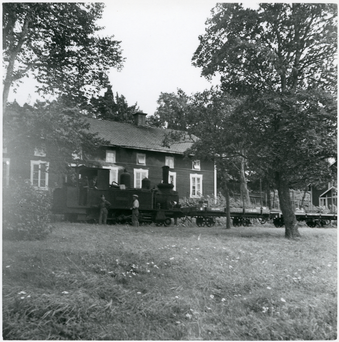 Bruksgatan i Lotorp, ånglok med tåg. Detta är troligen Finspong Lotorps Järnväg, FgLpJ lok 2 "Nordiska".