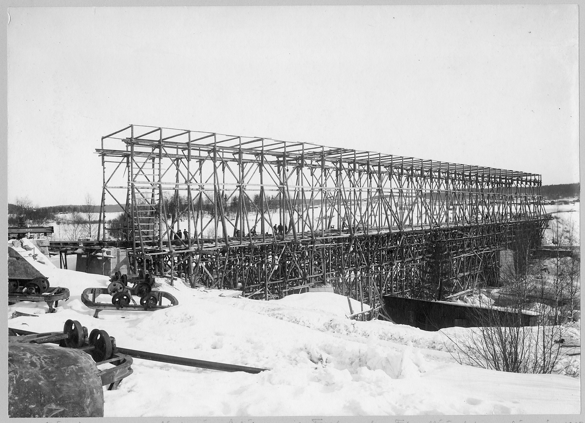 Titel: Ställningsbyggnad för brobygge vid Forshufvud över Dalälven.