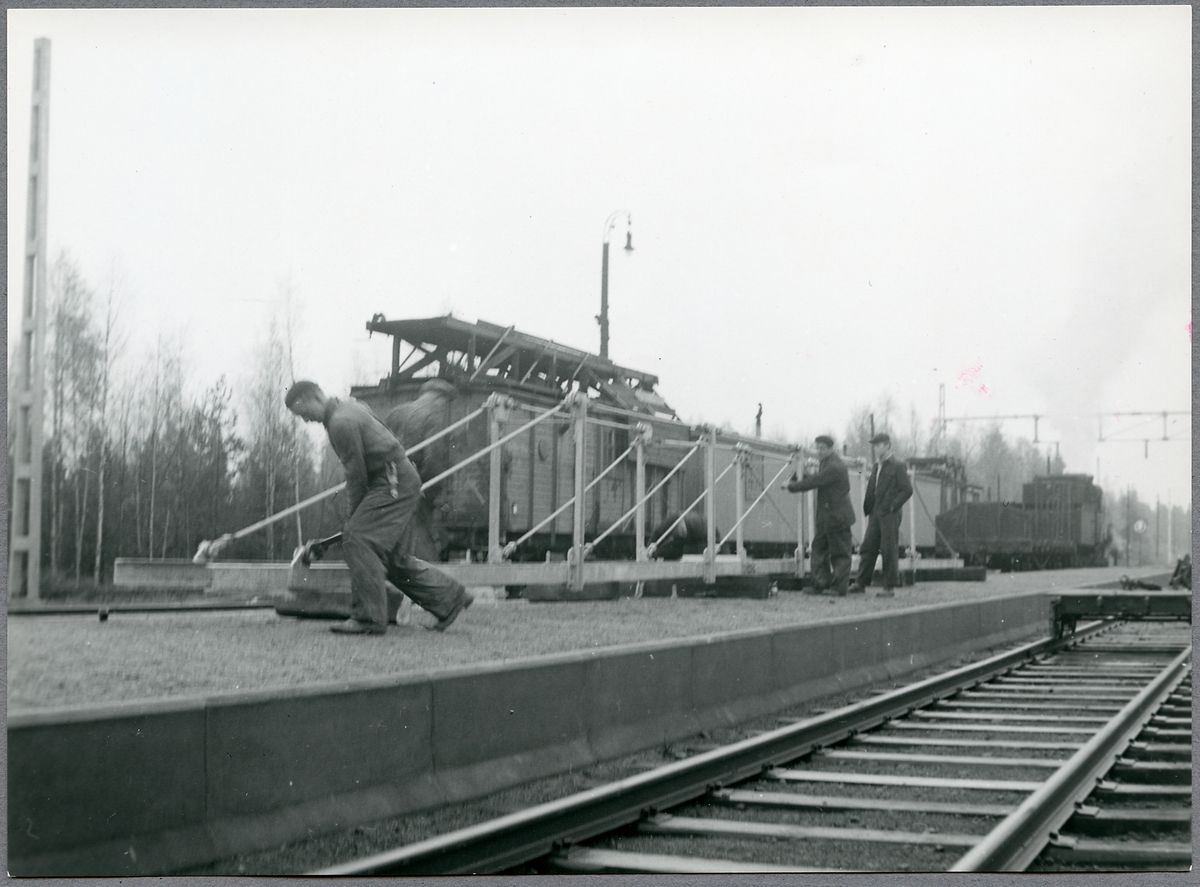 Titel: Monteringsförberedelser för elledningsstativ på Hamrångefjärdens station.