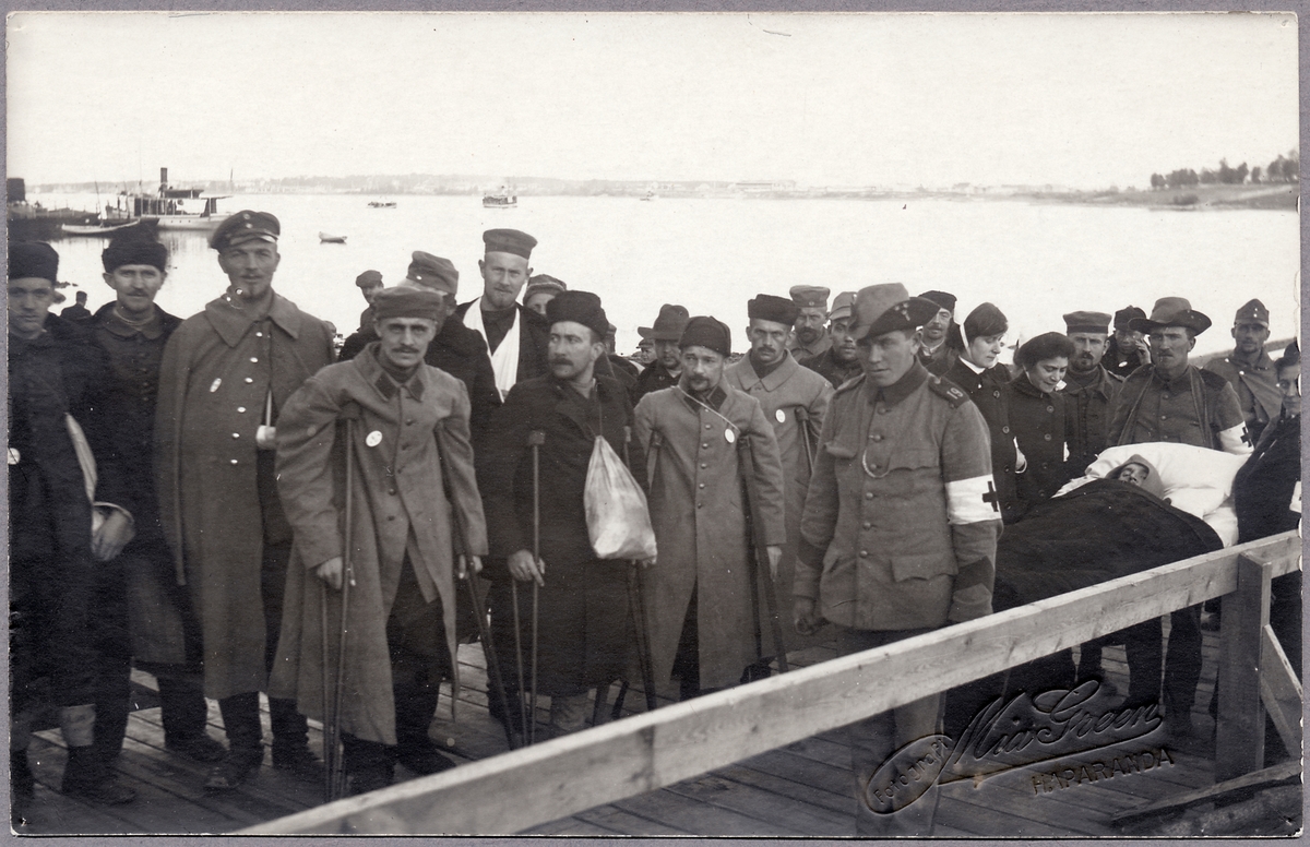 Skadade krigsfångar vid Haparanda skeppsbro under Första världskriget. Sedermera kom dessa att transporteras vidare från Haparanda till Trelleborg.