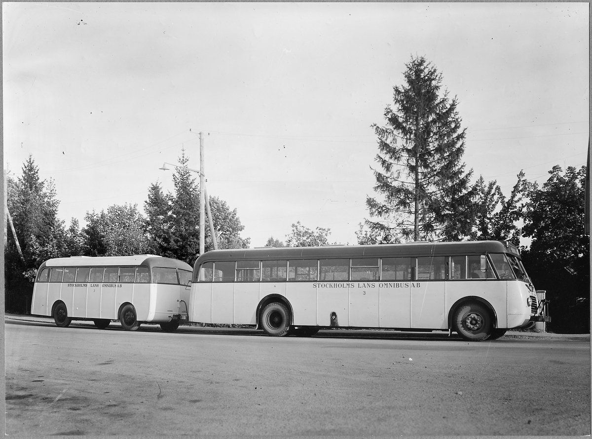 Volvo B 532 med tillkopplad personsläpvagn. Stockholms Läns Omnibuss AB, SLO (Stockholm-Roslagens Järnväg, SRJ).