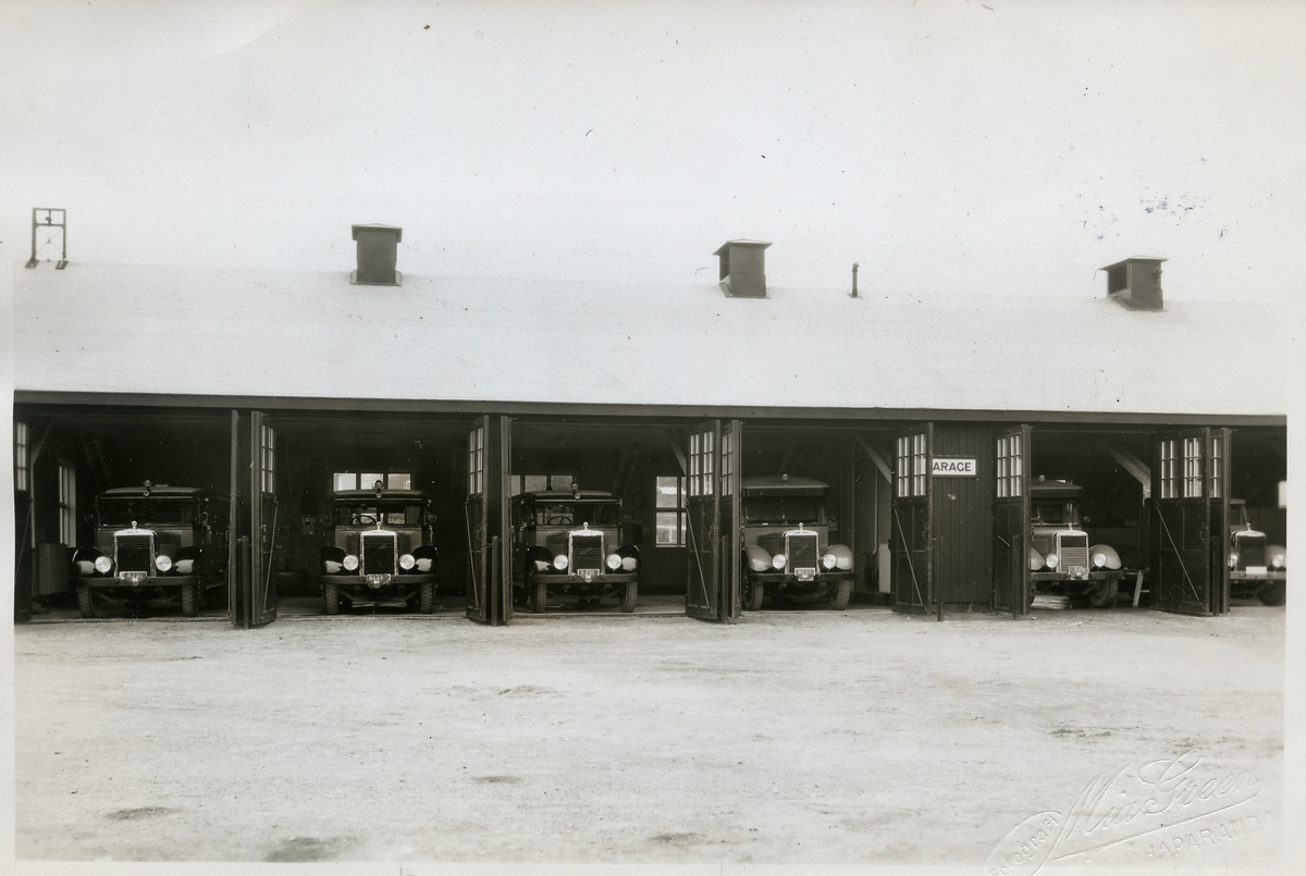 Bussar med registreringsnummer R226, R135, R231, R225, R196 i ett garage i Övertorneå.