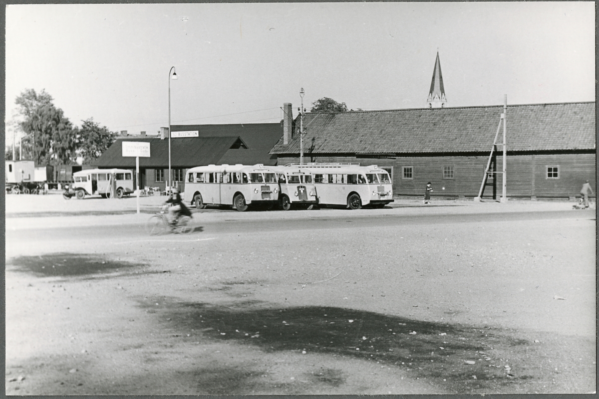 Titel: Arvika busstation med kyrktornet i bakgrunden.