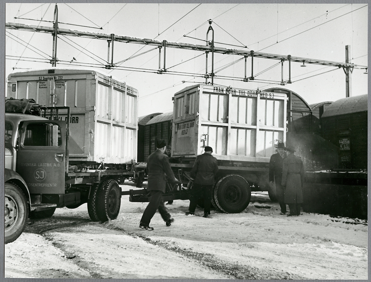 Lastning av storbehållare. Till höger ses Statens Järnvägar, SJ G 43399.