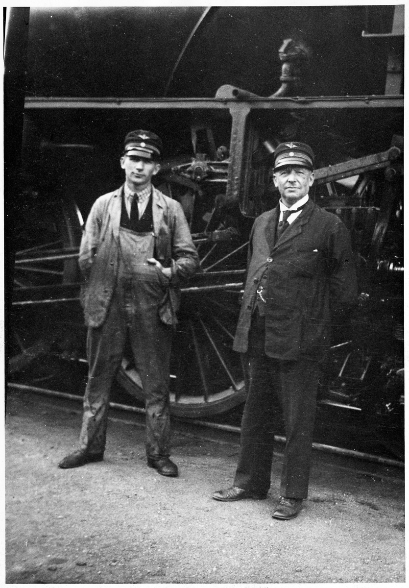 Lokeldaren Sigurd Törnkvist och Lokföraren Edvin Krain fotograferade i Uppsala 1932.