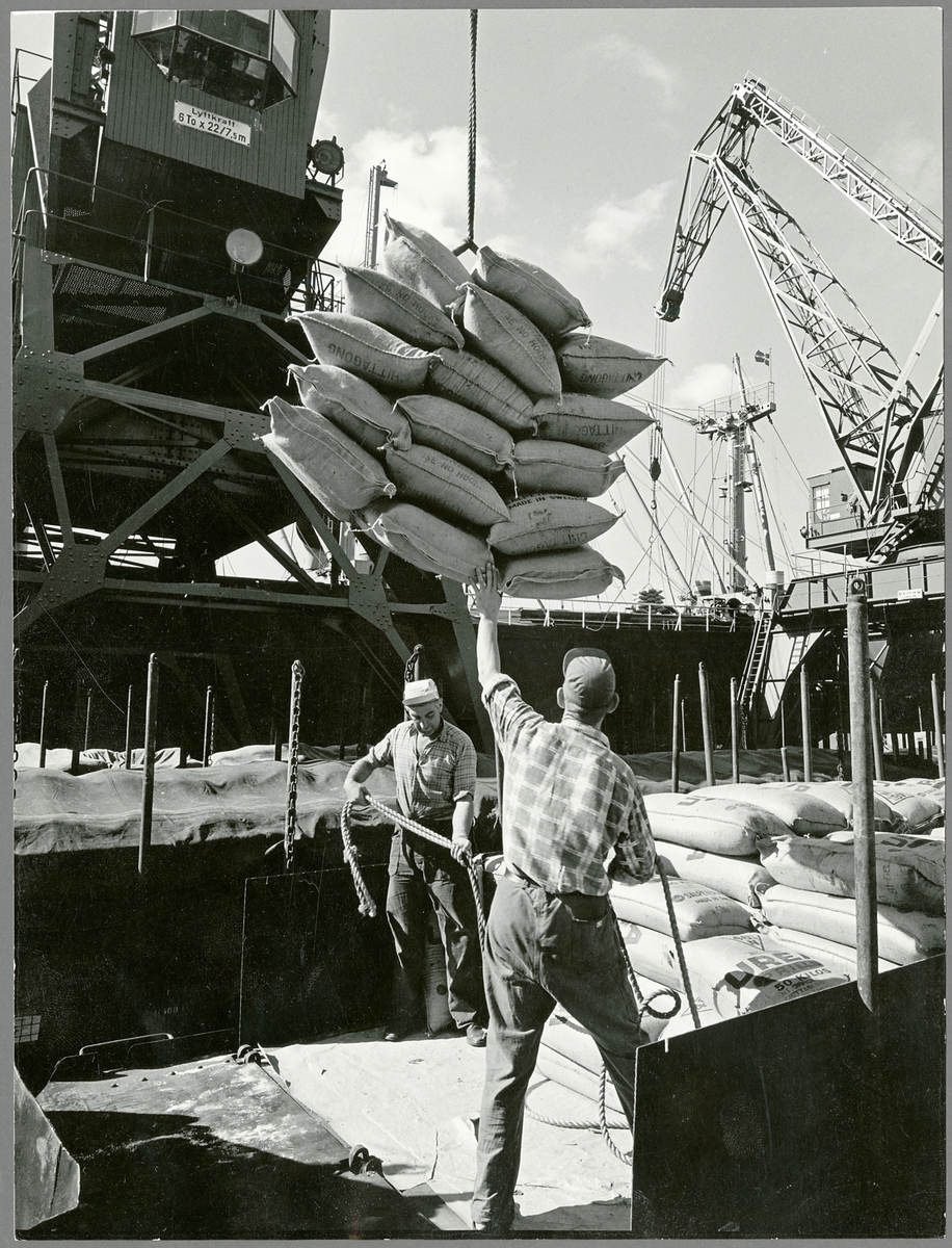 Titel: Lossning och lastning på godsvagnar vid Oxelösunds hamn.