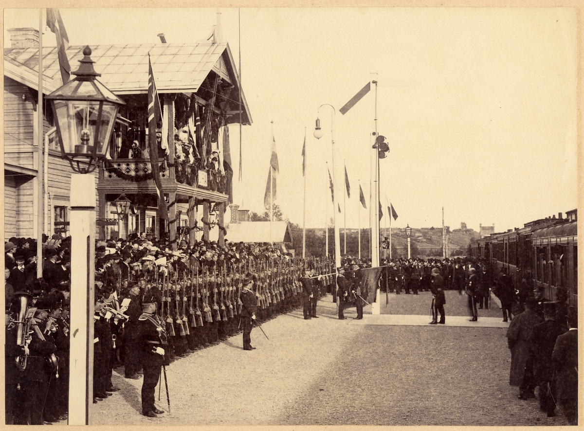 Mora station 14/9 1892 vid invigningen Mora-Vänerns Järnväg. Kungliga vagnar - vagnen längst bort är nr 1861. Vagnen närmast är troligen salongsvagn Ao.