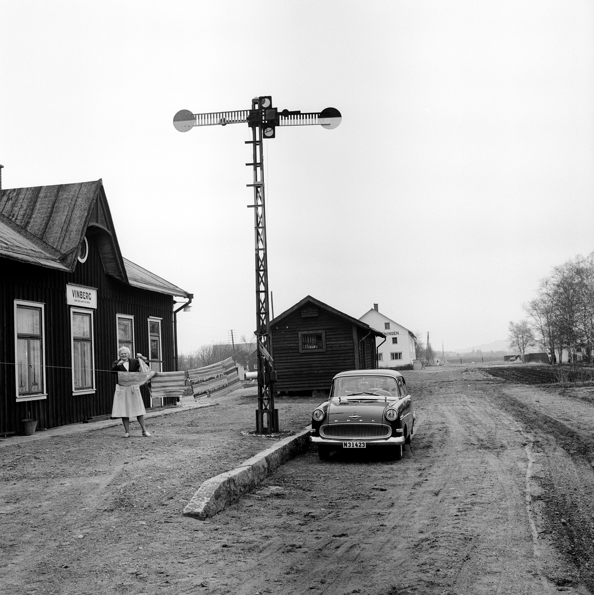 Tvättlina har fästs mellan flaggstång (ej i bild) och semafor för vädring/torkning av mattor. Järnvägsspåren har blivit en bilväg. Stationen lades ned 1959.