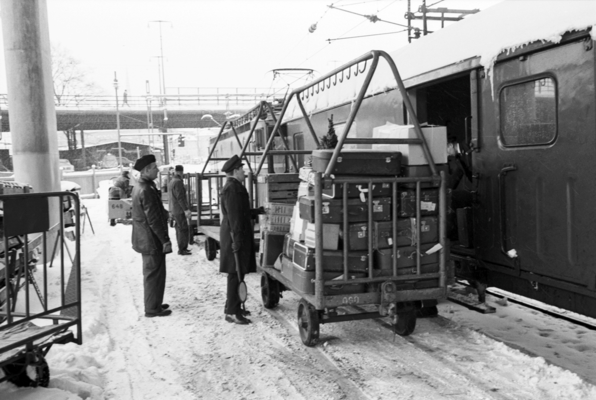 Jultrafiken vid Stockholm C, södra delen. lastning av resgods och bagage. Bron i bakgrunden är Klarastrandsbron över södra utfarten från Stockholm C mot Norra Järnvägsbron och Riddarholmen.