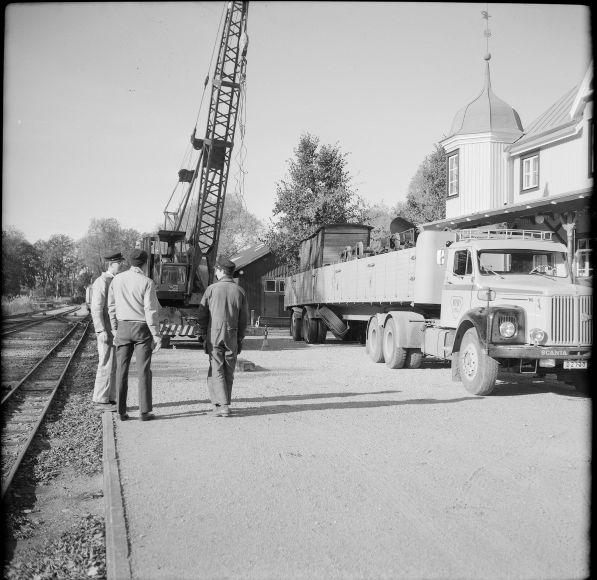 Lastbil med järnvägsgods utanför stationhuset i Mariefred som användes av Museijärnväg Östra Södermanlands Järnväg, ÖSlJ.