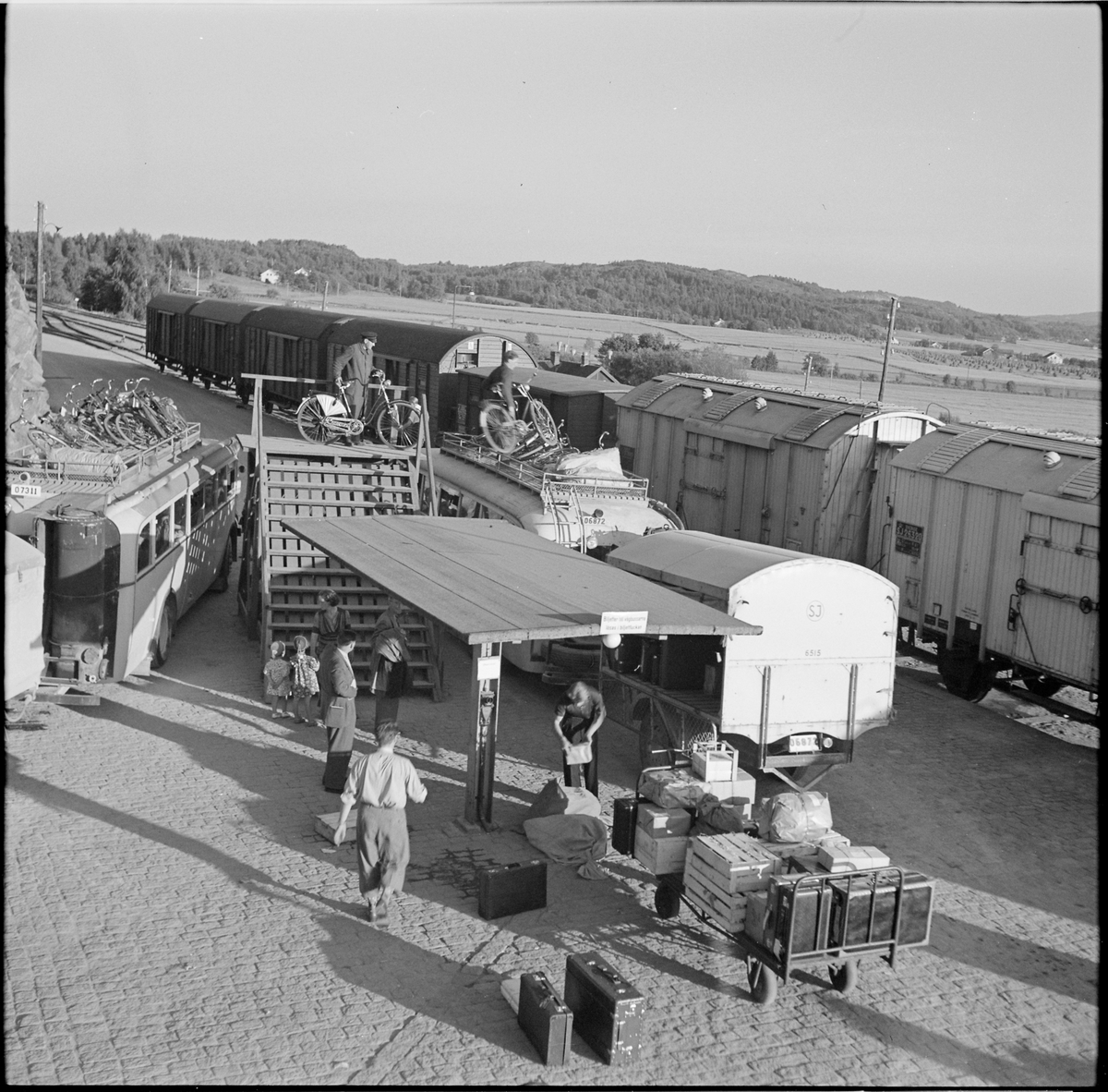 Lastning av cyklar mellan bussar och godsvagnar på bangård. Kylvagn Statens Järnvägar, SJ H 26320 till höger.