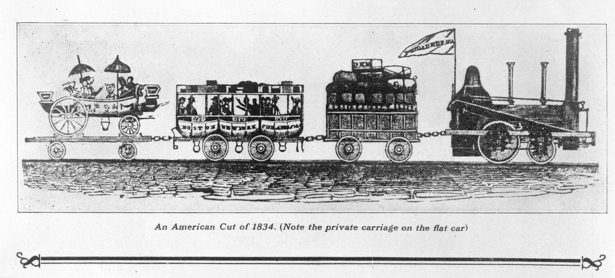 Illustration föreställande tågsätt i USA, 1830-tal.