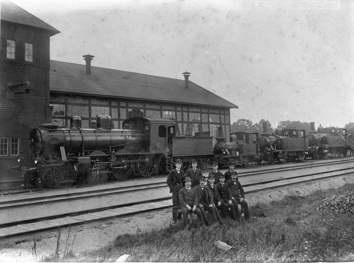 GSJ Slottskogens lokstall och vattentorn. Loken är från vänster lok nummer 5, 4, 3 och 1. Personerna på bilden är från vänster. Stående: M Johansson, E Claesson, H Sunnergren, S Eriksson. Sittande: G Dahlén, O Lindström, G Olsson, A Andersson.