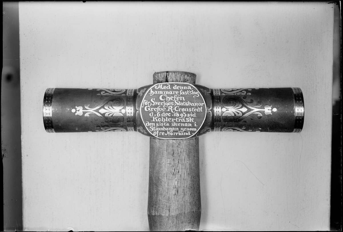 Rälshammare med texten: "Med denna hammare fastslog chefen för Sveriges Statsbanor Grefve R Cronstedt d. 6. dec. 1893 vid Koblerträsk den sista skenan i Stambanan genom öfre Norrland".