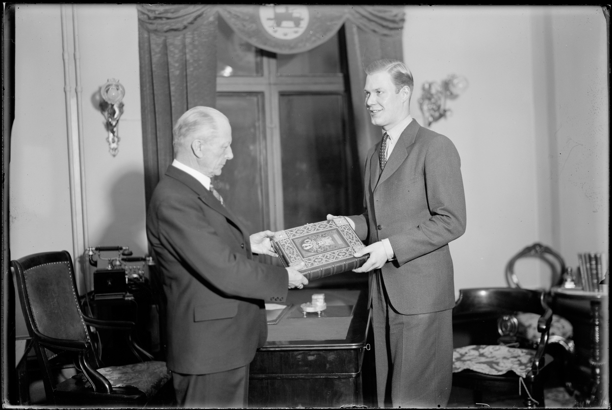 Titel: Greve Cronstedt överlämnar ett album till Major Werner.