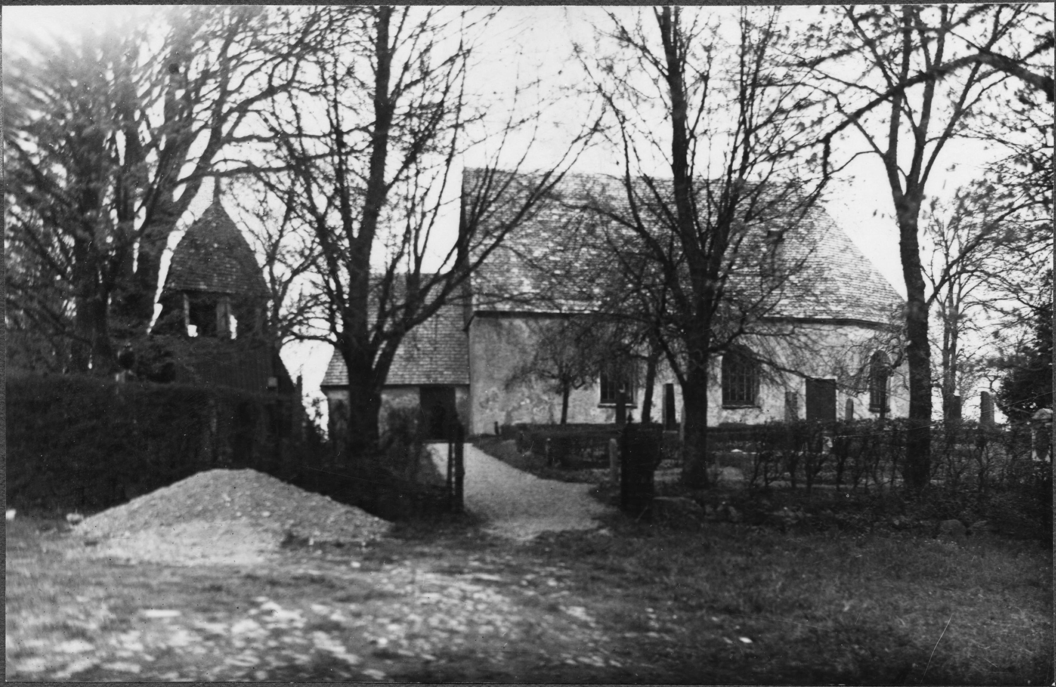 Kyrkan och klockstapeln från syd.