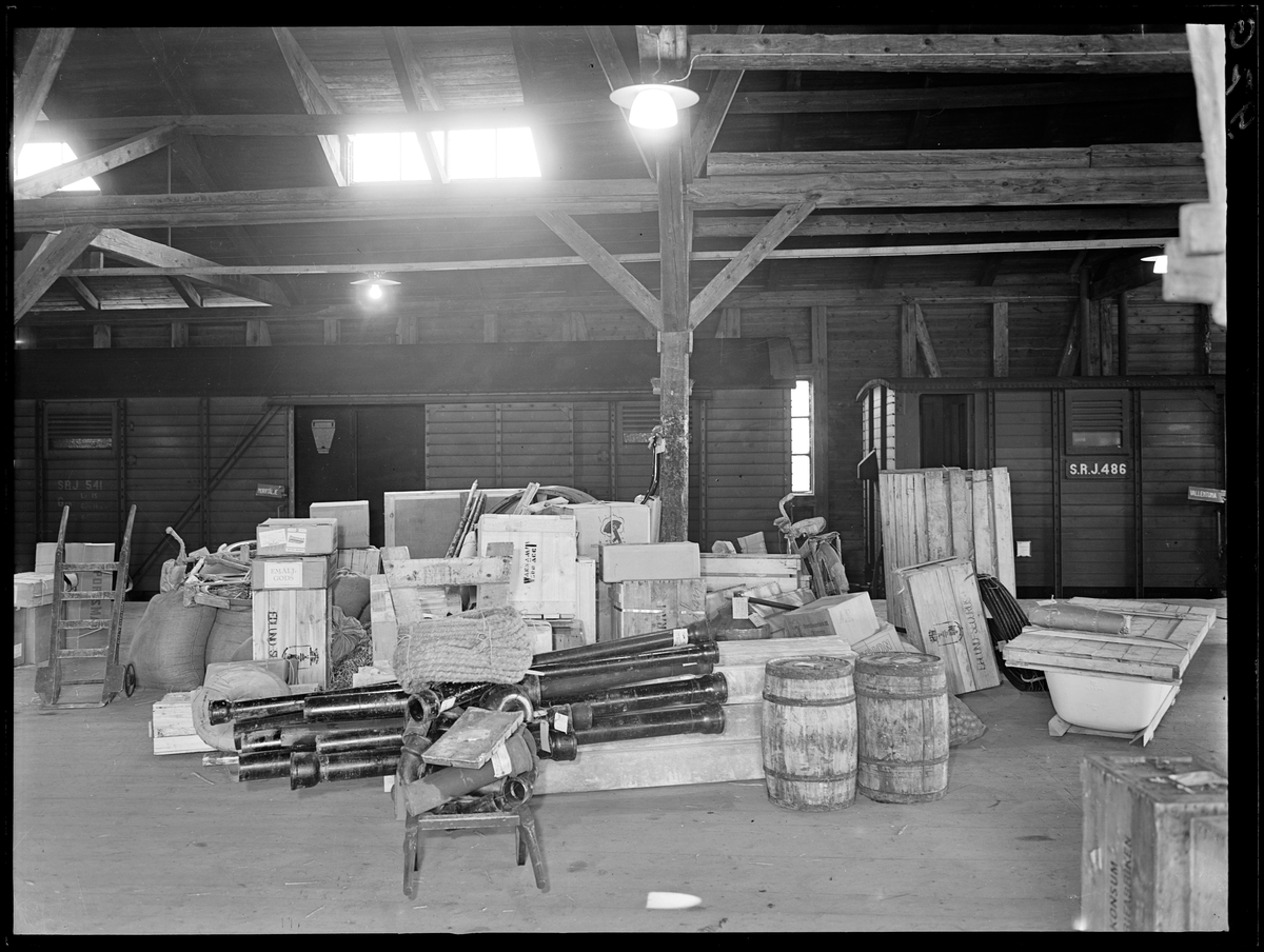 Interiör av godsmagasin tillhörandes Stockholm - Roslagens Järnvägar. SRJ Gsh 541 och SRJ godsvagn 486 syns vid lastkajen.