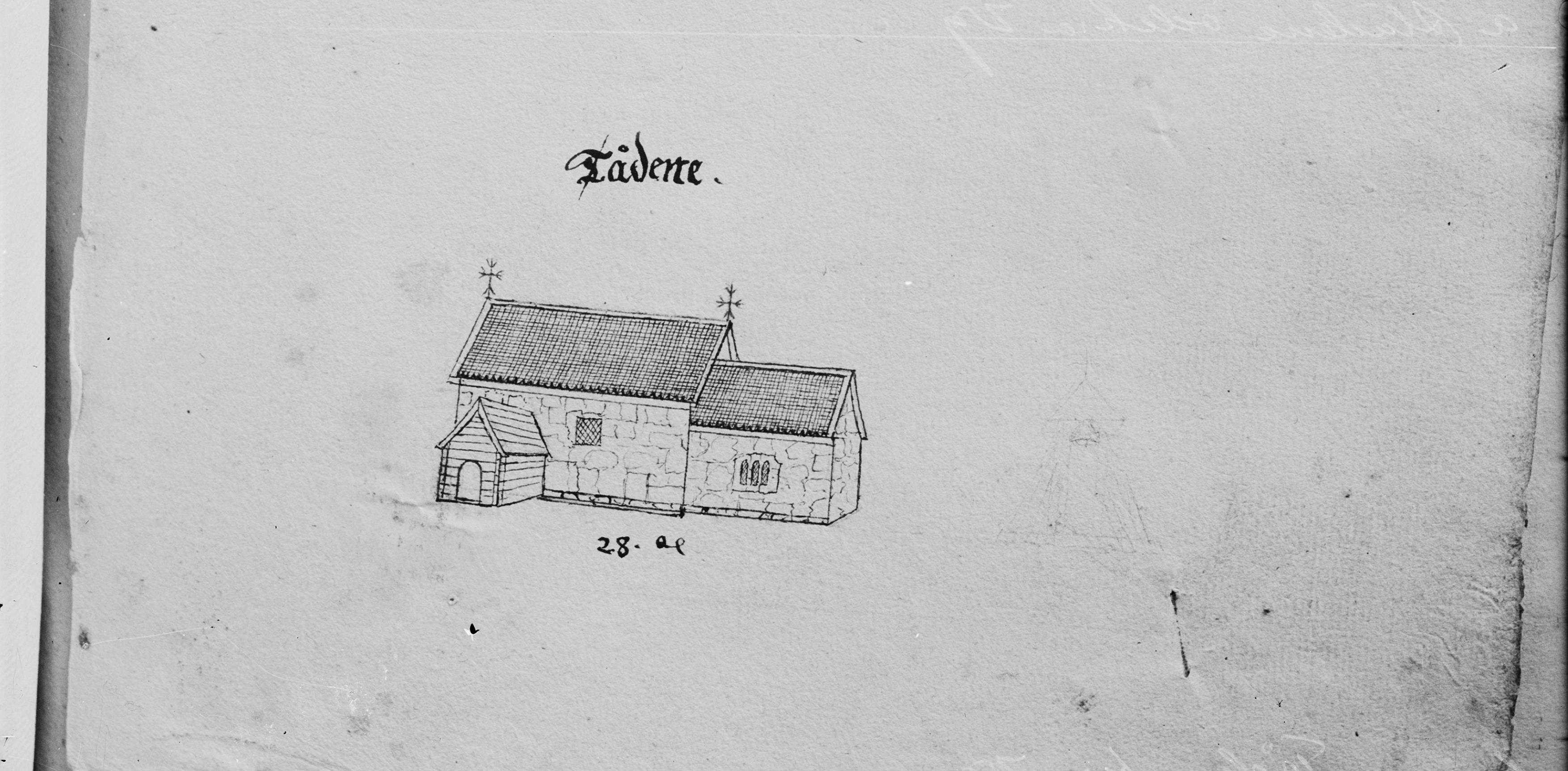 Kyrkan från söder, teckning i Peringskiölds Monumenta, avfotograferad.