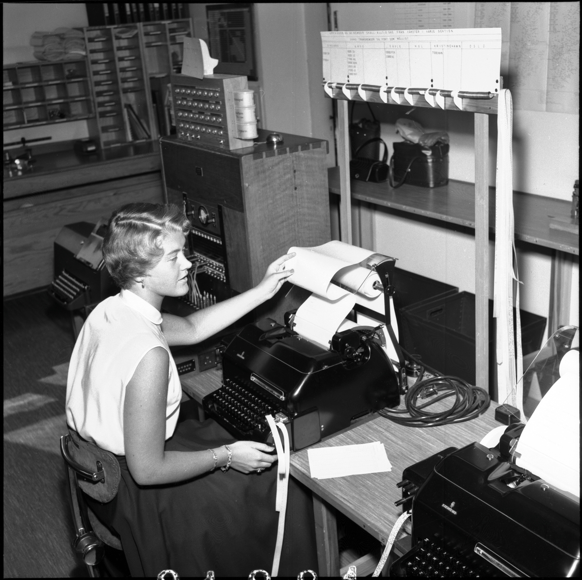 Kvinna i arbete med telexanläggning på Centralstation i Stockholm.