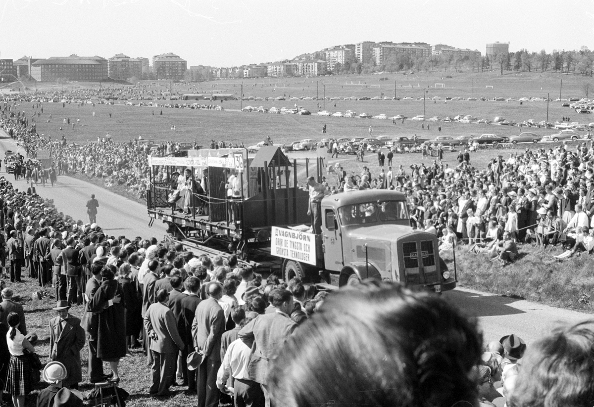 Statens Järnvägar, SJ Oe 86688. Studentkarneval på Gärdet i Stockholm. Öppen godsvagn lastad på vagnbjörn.
