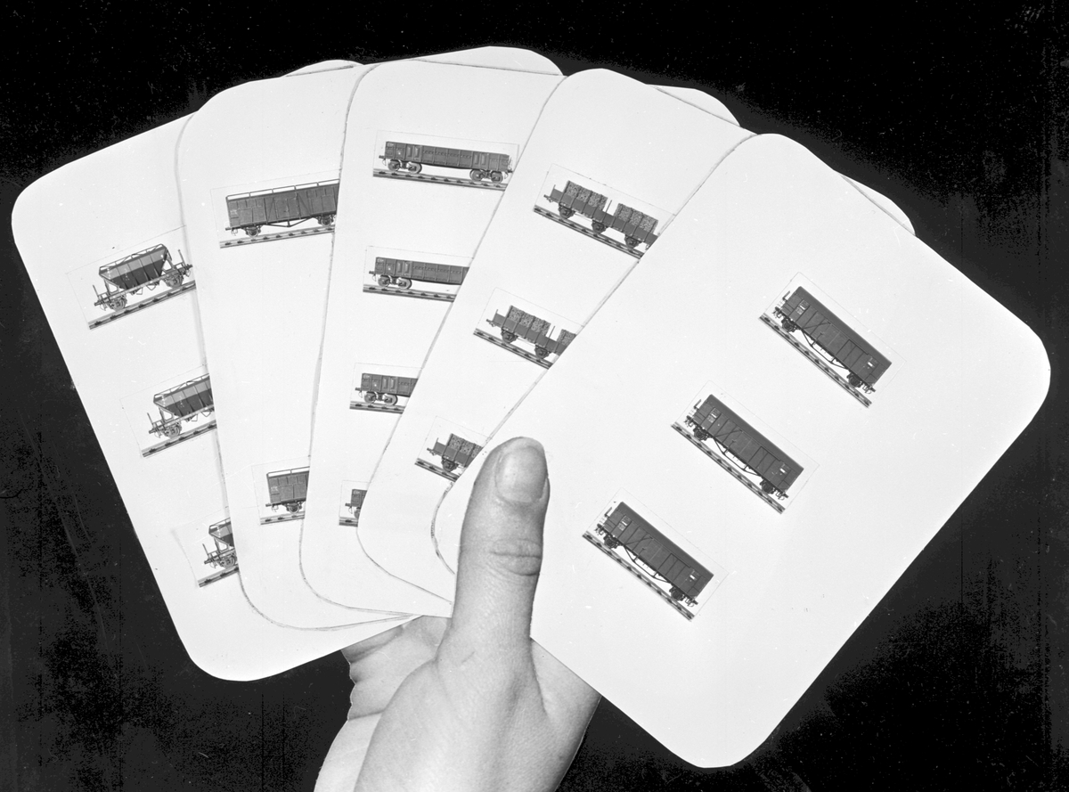 Fotomontage, hand hållandes spelkort med godsvagnar.