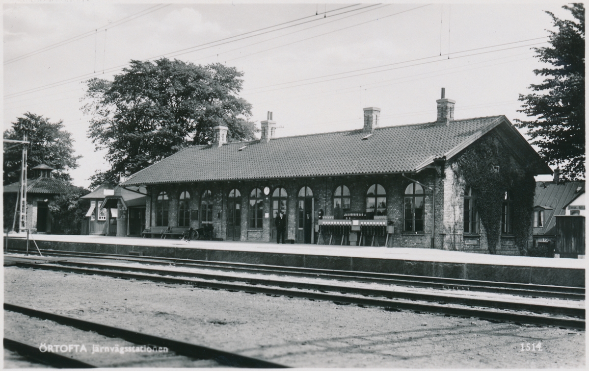 Örtofta station. Statens Järnvägar, SJ. Banan öppnades 1857 och fick eldrift 1933. Stationen revs och 1983 byggdes en hållplats där.