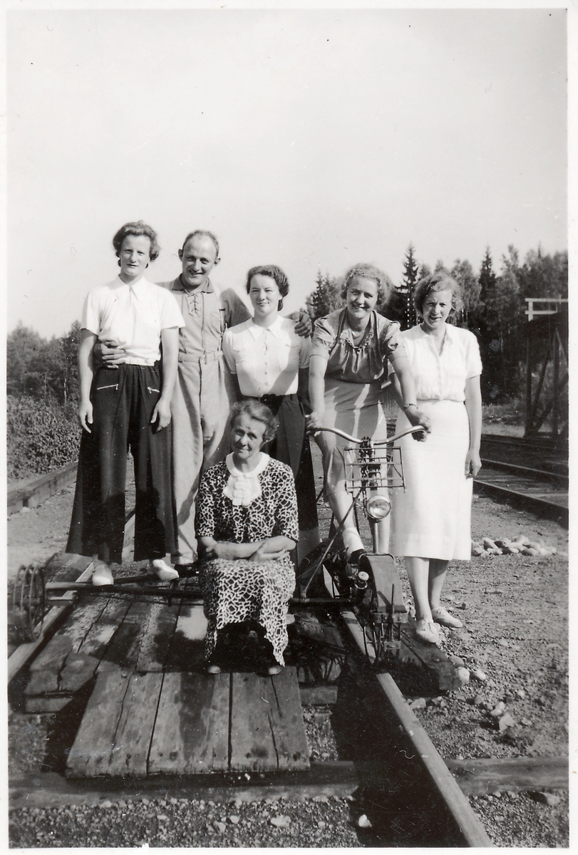 Bakre raden från vänster: Sigrid "Siri" Andersson med fästmannen/maken Anders Lindgren, Ingeborg Andersson, okänd kvinna på cykeldressin, Ingrid Andersson samt sittandes på trallan: Tekla Andersson.