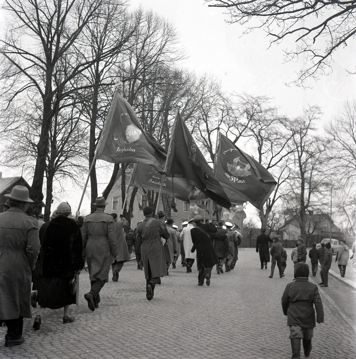 Titel: Första majtåg med mässingsorkester passerar Borgholms rådhus vid torget.