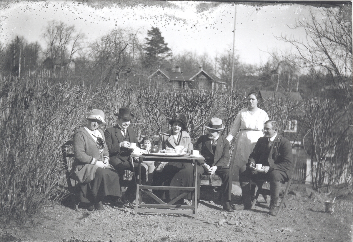 Kaffe i trädgården vid läkarebostaden. I bakgrunden Sommarpensionatet.