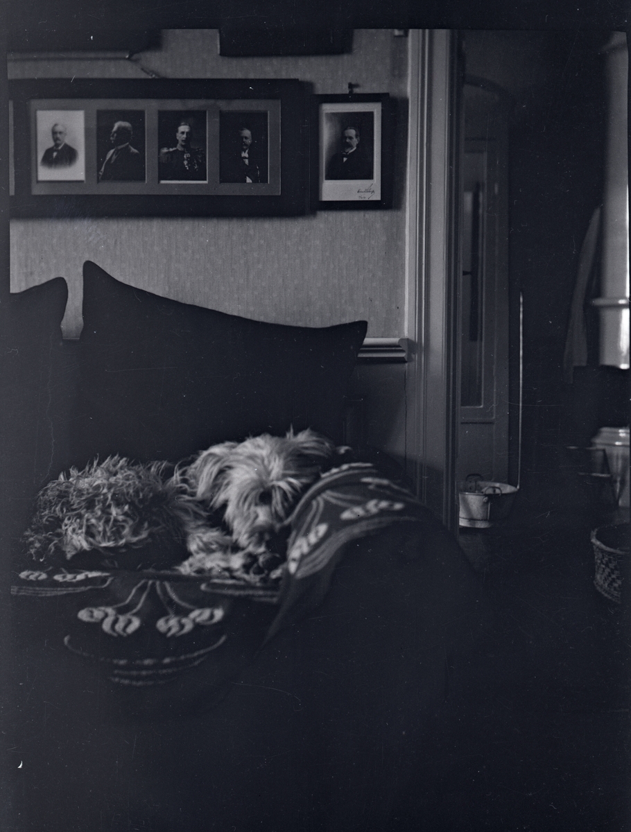Interiör i Tuna gårds huvudbyggnad. Hund på soffa.