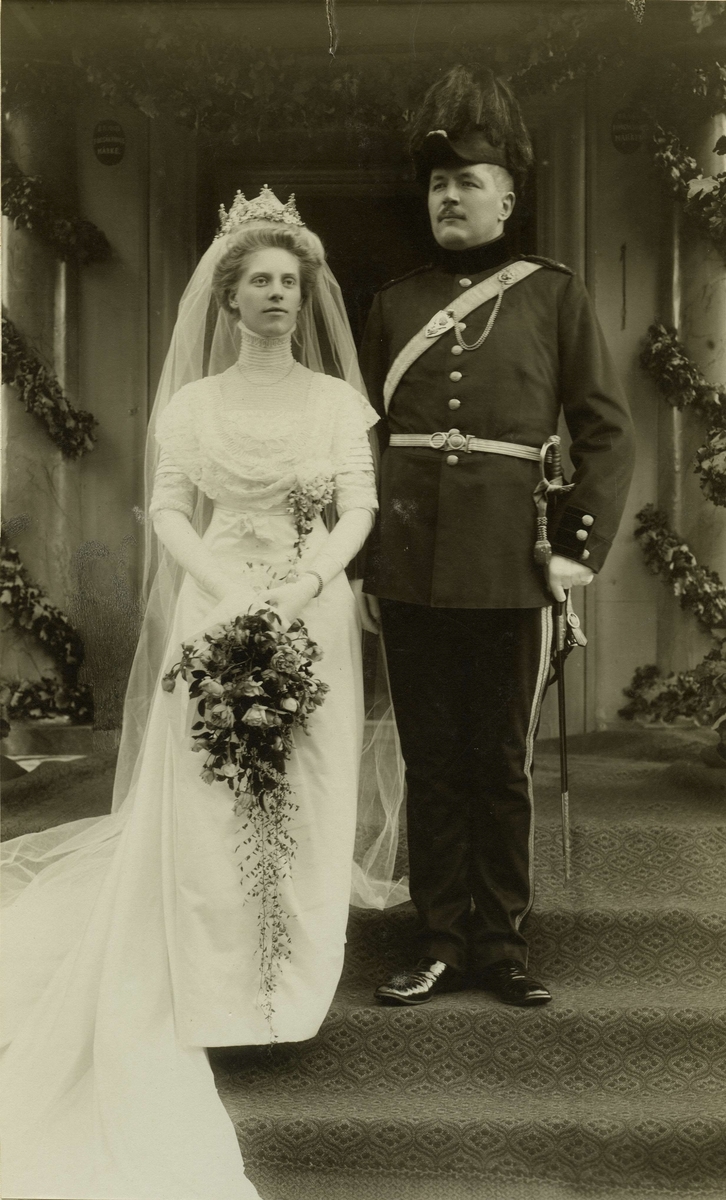Brudkort, visande friherre Ludvig Bernhard Rappe (1847-1906) och makan Anna Eva Jaquette Tersmeden (1863-1951) vid vigseln i Örebro 1883. Makarna bosatte sig på Christinelund där de fick sex barn varav fem levde till vuxen ålder, Sedan maken dött 1906 skötte friherrinnan godset i många år. Hon avled dock i Varberg sonen där Adolf Hilding (1895-1954) var stadsläkare.