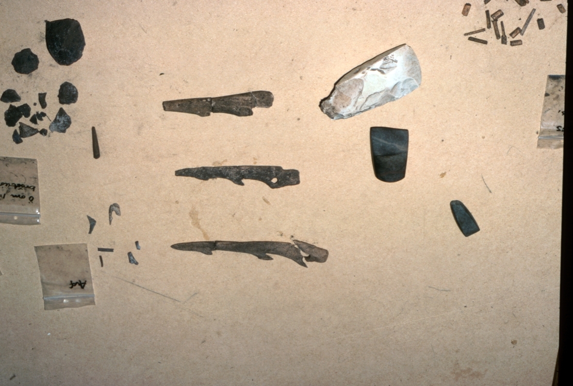 Arkeologiska fynd från Köpingsvik. Bland annat harpun och metkrokar från stenåldern.