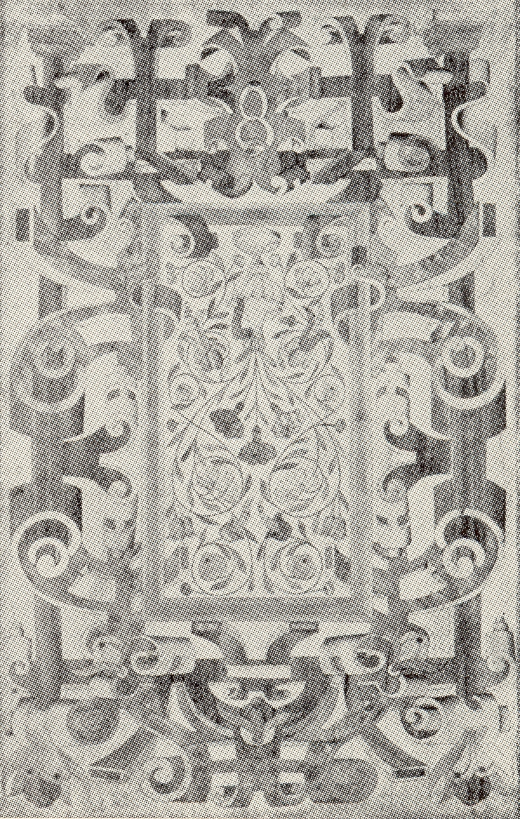Titel: Fyllningar med intarsiadekor från ett sydtyskt skåp, omkring 1560. Efter v. Falke. På vissa plåtar har Martin Olsson klistrat eltejp för att markera hur bilden skulle beskäras i boken.