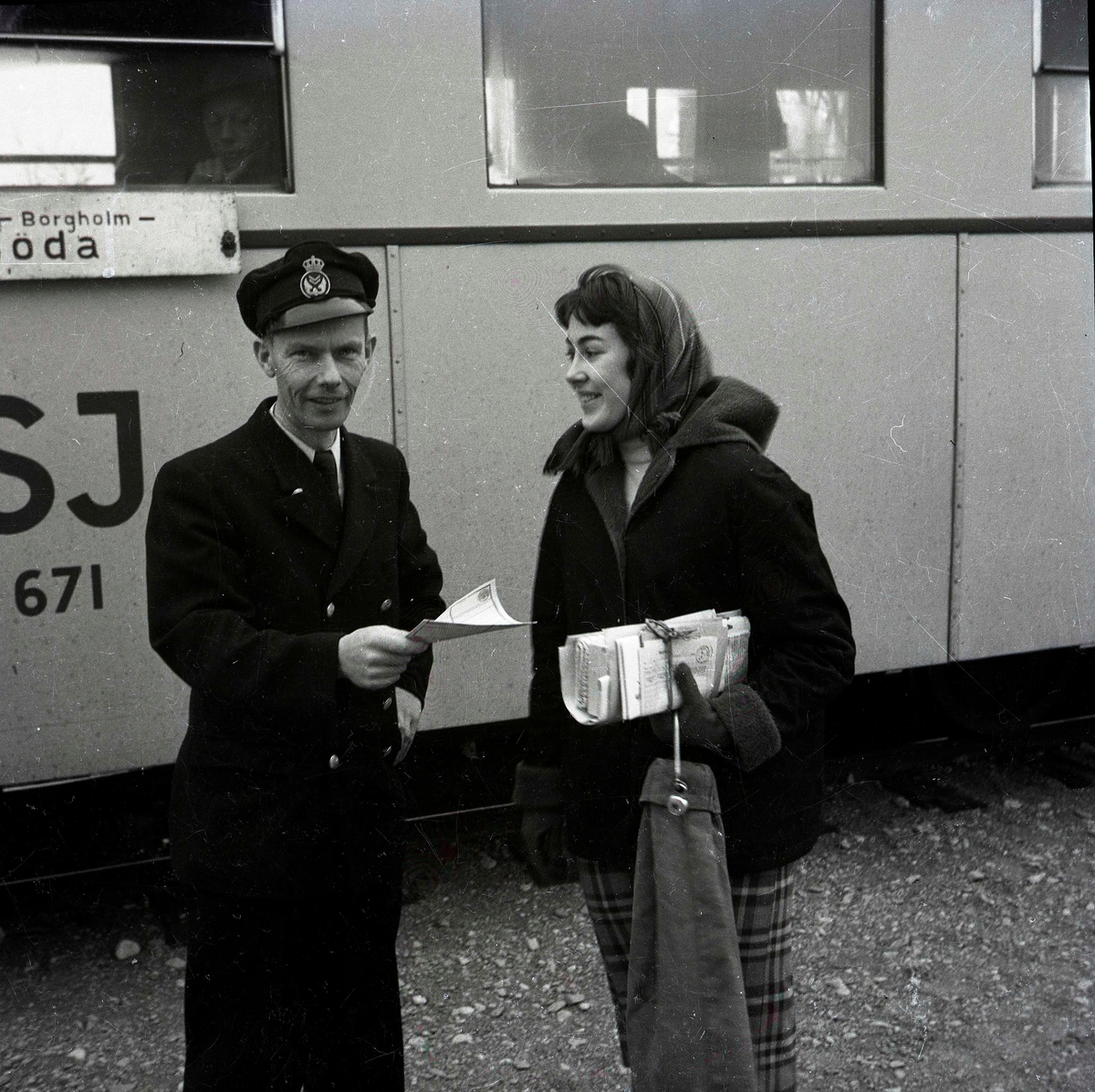 En tjänsteman och en kvinna framför en rälsbuss vid Ölands järnväg.