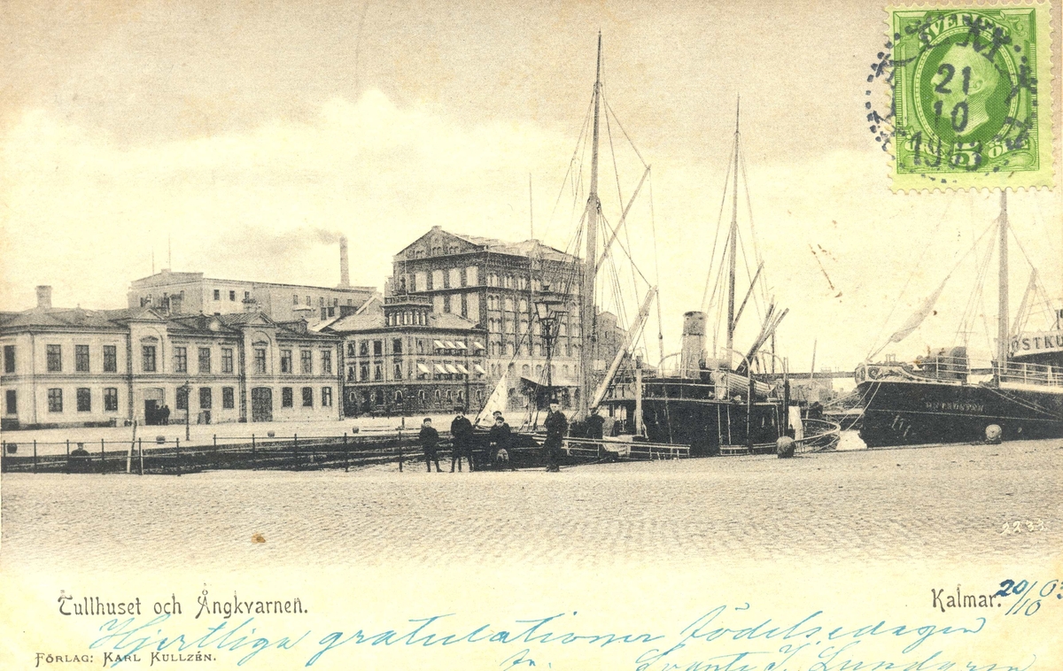Vykort föreställande Tullhuset och Ångkvarnen i Kalmar.