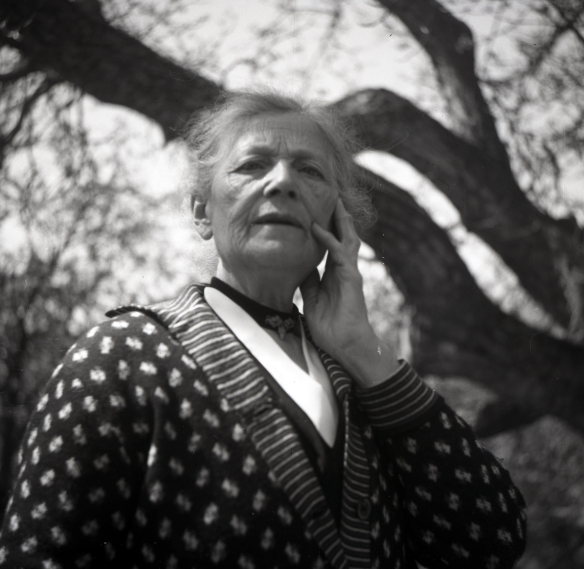 Hulda Nydell, hushållerska på Krusenstiernska gården. Hulda ärvde gården efter pareet Krusenstierna och valde sedan att själv testamentera byggnader och mark till Kalmar kommun och inventarierna till Hembygdsföreningen i Kalmar.