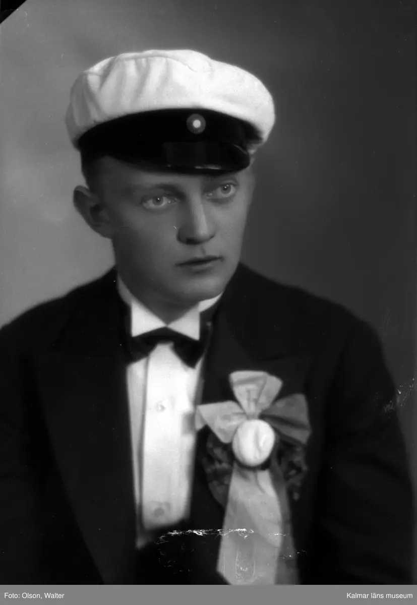 Ateljébild på en man som har tagit studentexamen. Han har en studentmössa och studentkrans. Enligt Walter Olsons journal är bilden beställd av Göte Ohlsson.