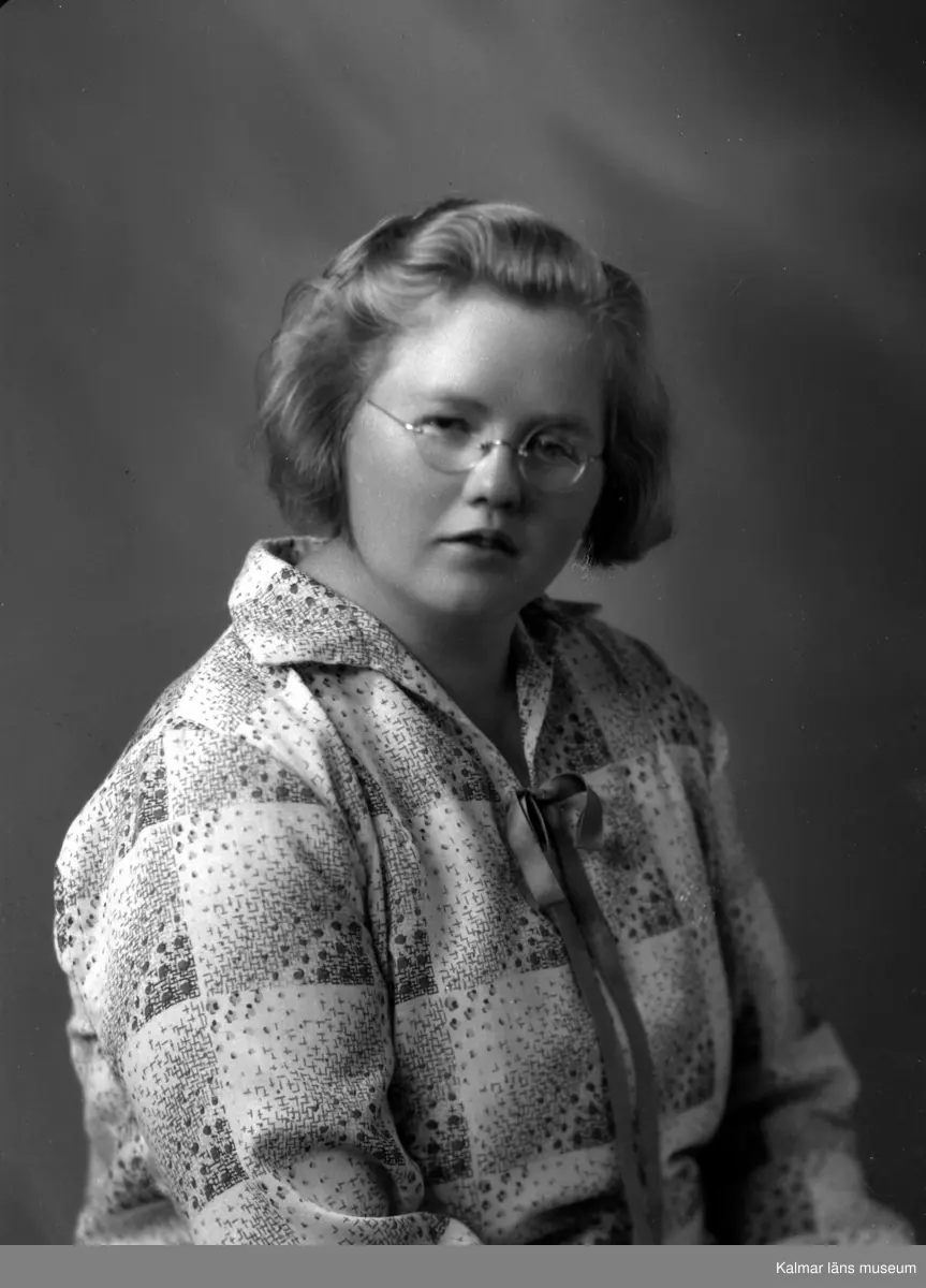 Ateljébild på en kvinna i blus och glasögon. Enligt Walter Olsons journal är bilden beställd av Lisa Sjöström.