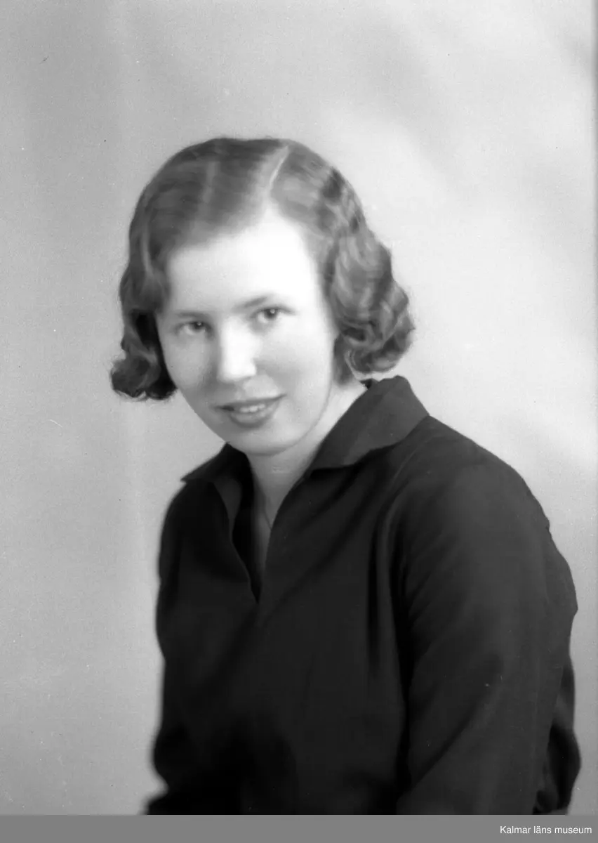 Ateljébild på en kvinna i bussarong och ondulering. Enligt Walter Olsons journal är bilden beställd av Iris Karlsson ifrån Pukeberg i Nybro.
