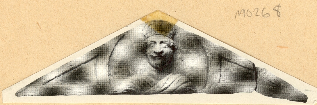 Gavelfält för brunnsöverbyggnaden på Kalmar slott med karikatyr av Oscar I utförd vid restaureringen 1851-51. Nu magasinerad.