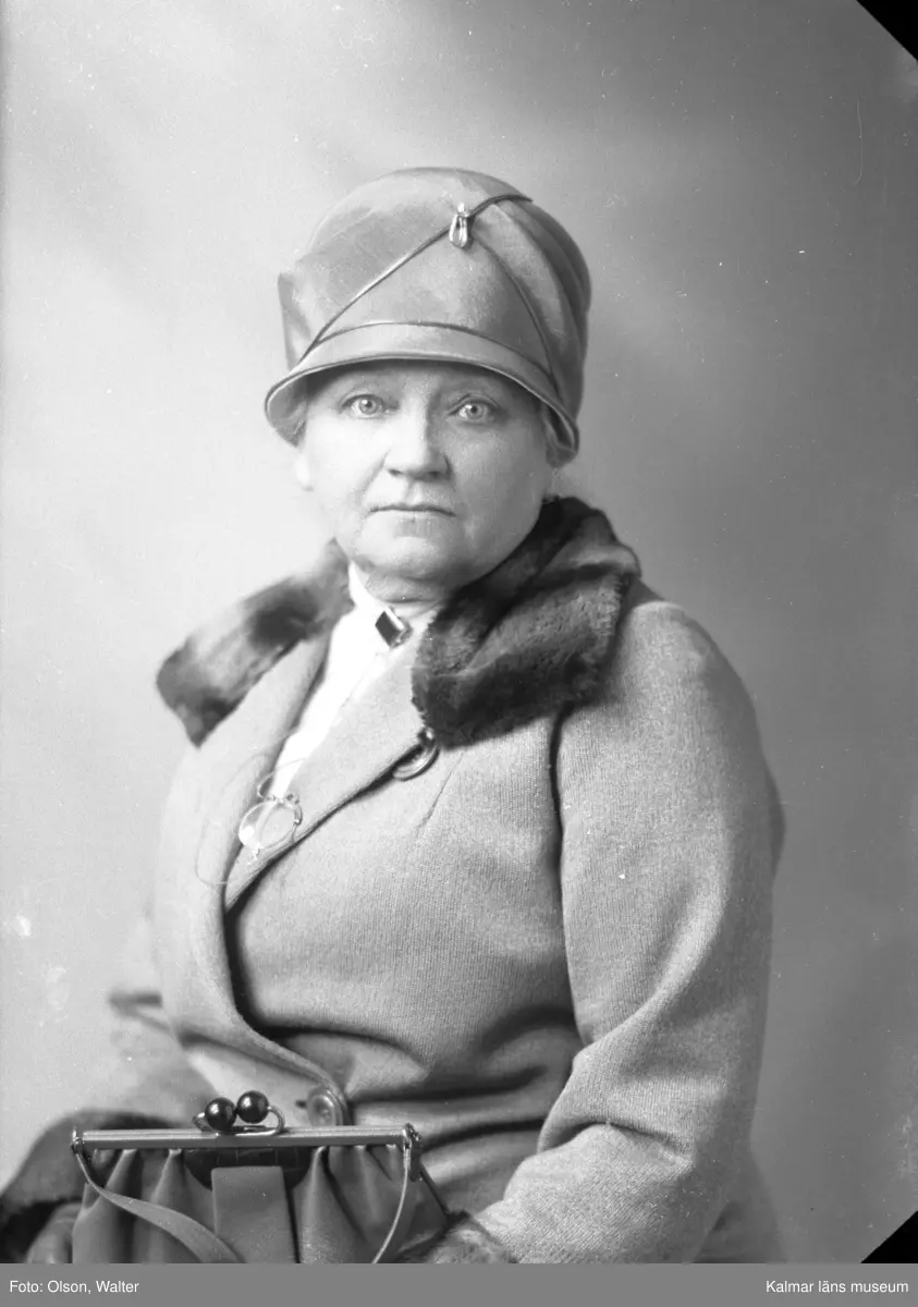 Ateljébild på en kvinna i hatt, handväska och kappa. Enligt Walter Olsons journal är bilden beställd av fru Cohrs.