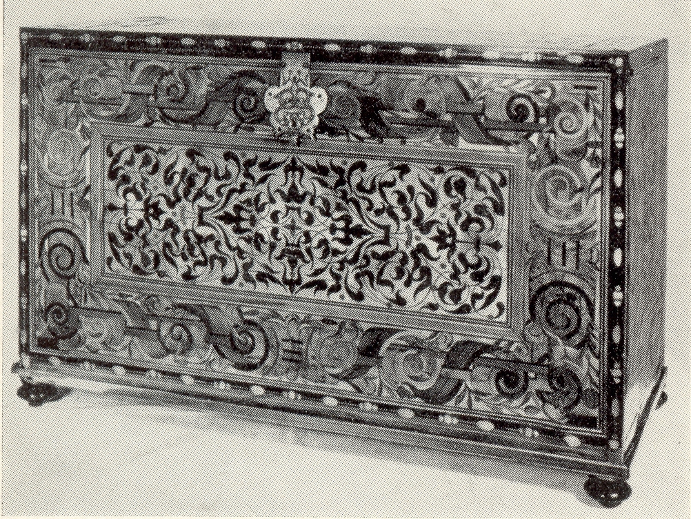 Kabinettskåp med intarsiaornering, sydtyskt arbete, 1500-talets tredje fjärdedel. Efter Möller.