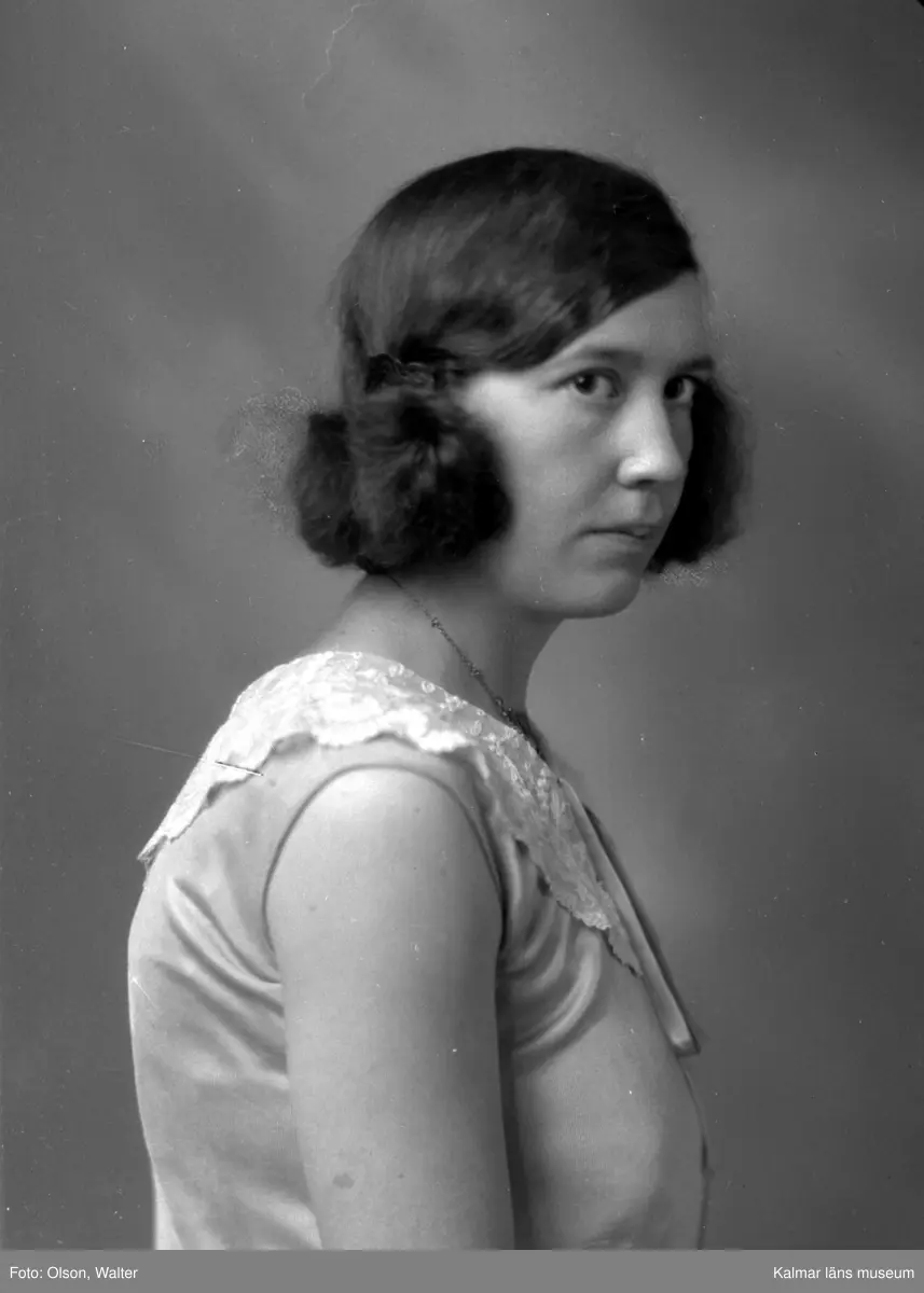 Ateljébild på en kvinna i halsband och klänning. Enligt Walter Olsons journal är bilden beställd av Viola Pettersson.